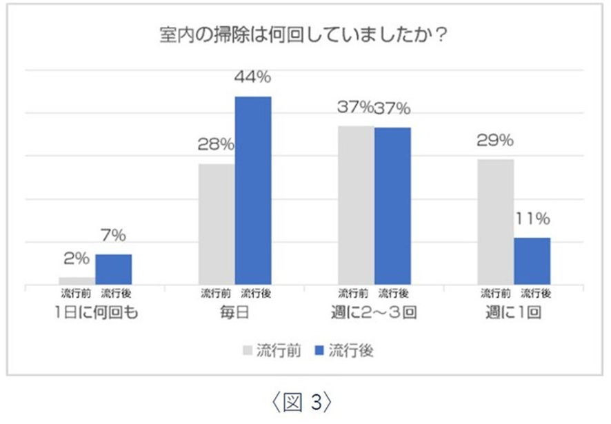 掃除の頻度についても、コロナ流行前と比べて毎日掃除をする人が44%に増加しており、