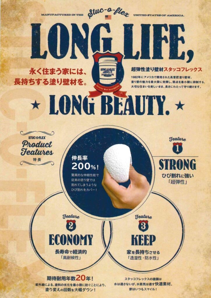 スタッコフレックスの施工によって、塗り替えの回数を大幅に減らすことができるので、長期的に見ればメンテナンスにかかる費用も抑えることができます。
